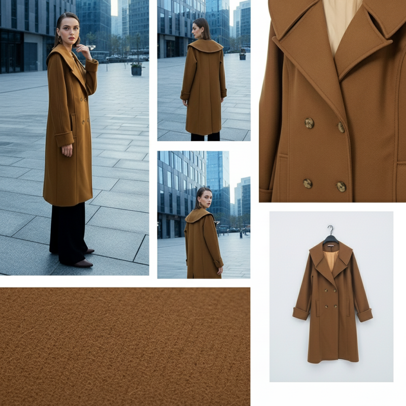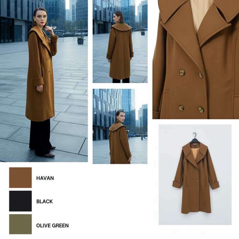 معطف أنيق متوسط الطول. يتميز بياقة شال عريضة وناعمة وإغلاق بصفين من الأزرار مثبتة بزرين بارزين. يتميز المعطف بقصة مصممة ومفصلة على الجسم ويشمل جيوباً جانبية خفية. الأكمام طويلة، ومصممة بأساور عريضة مطوية. هذه قطعة لا تتأثر بمرور الزمن، ومثالية للارتداء المهني أو لإضافة الرقي إلى أي مظهر شتوي.