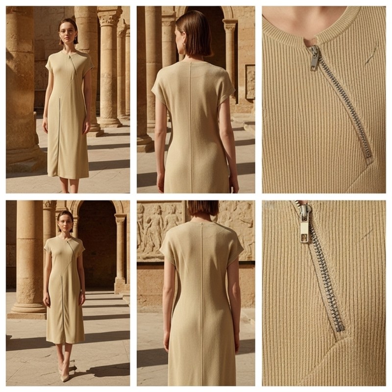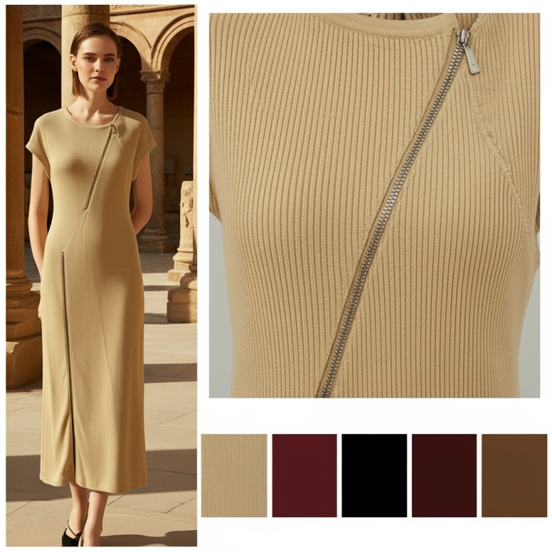 فستان طويل بسيط بدون أكمام، يتميّز بقصّة مستقيمة. يأتي مع سحّابين ظاهرين — واحد مائل عند منطقة الصدر وآخر يمتد بشكل طولي في الأمام لإضفاء لمسة عملية وعصرية. مصنوع من قماش مريح وناعم مناسب للإطلالات اليومية والكاجوال.