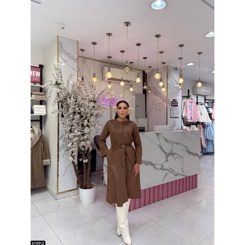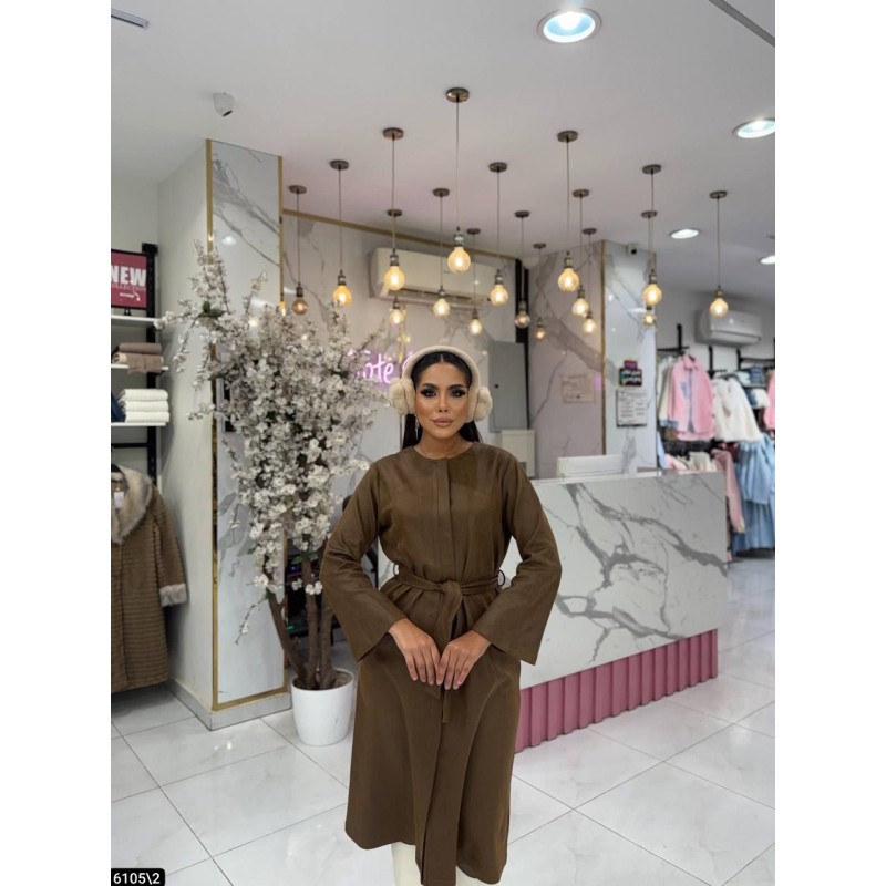 A modest mid-length coat featuring a clean, minimalist design with a waist belt for an adjustable, flattering fit. The coat has long sleeves, a straight silhouette, and a collarless neckline for a modern, elegant look. Perfect for everyday wear, casual outings, and refined winter styling