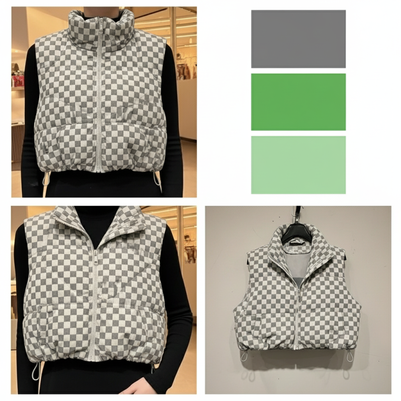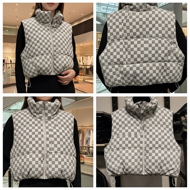 Tags: checkerboard vest, quilted puffer vest, cropped vest, high neck vest, streetwear vest, winter layering, graphic print vest, zip-up vest
