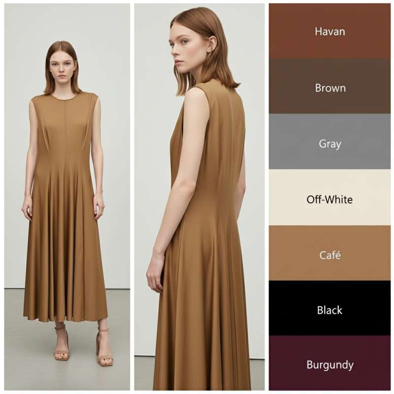 A timeless sleeveless maxi dress crafted from smooth, lightweight fabric. The dress features a fitted bodice that gently flares into a full, flowing skirt, offering both comfort and sophistication. Perfect for casual outings, semi-formal gatherings, or layered with a blazer for an elevated chic look