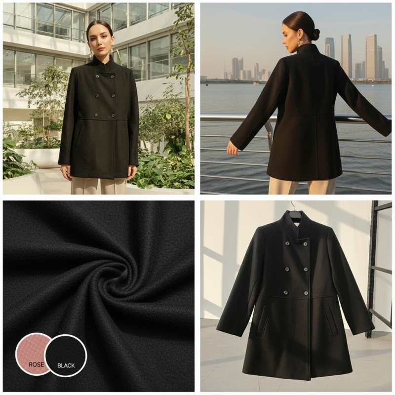 A stylish, mid-length winter coat featuring a refined double-breasted closure for added warmth and elegance. Designed with a structured high collar and a fitted waist to enhance the silhouette. The coat includes two side pockets for functionality and a clean, minimalist back panel. Ideal for both casual and formal winter wear