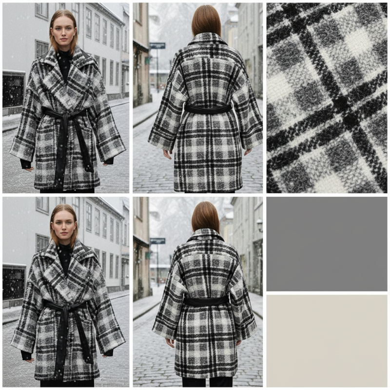 A cozy mid-length fur coat featuring a plaid pattern. Designed with an open front and a sleek black waist belt for adjustable fit. It has a soft textured finish, wide sleeves, and a relaxed silhouette for comfortable winter wear. Ideal for casual and chic layered outfits