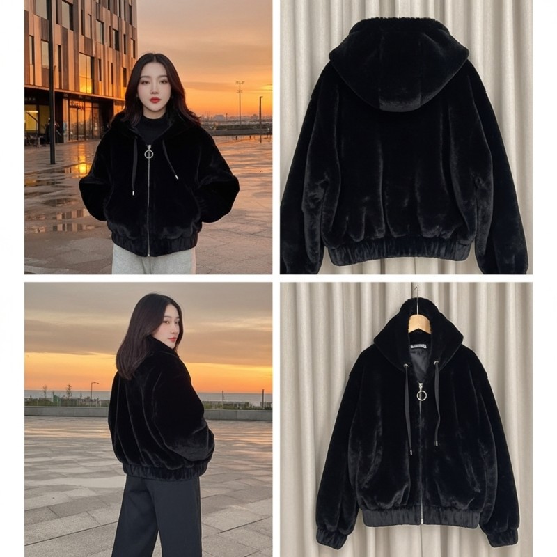 Tags: fur bomber, hooded fur jacket, cropped jacket, fur, zip-up fur, winter casual, outerwear, cozy bomber