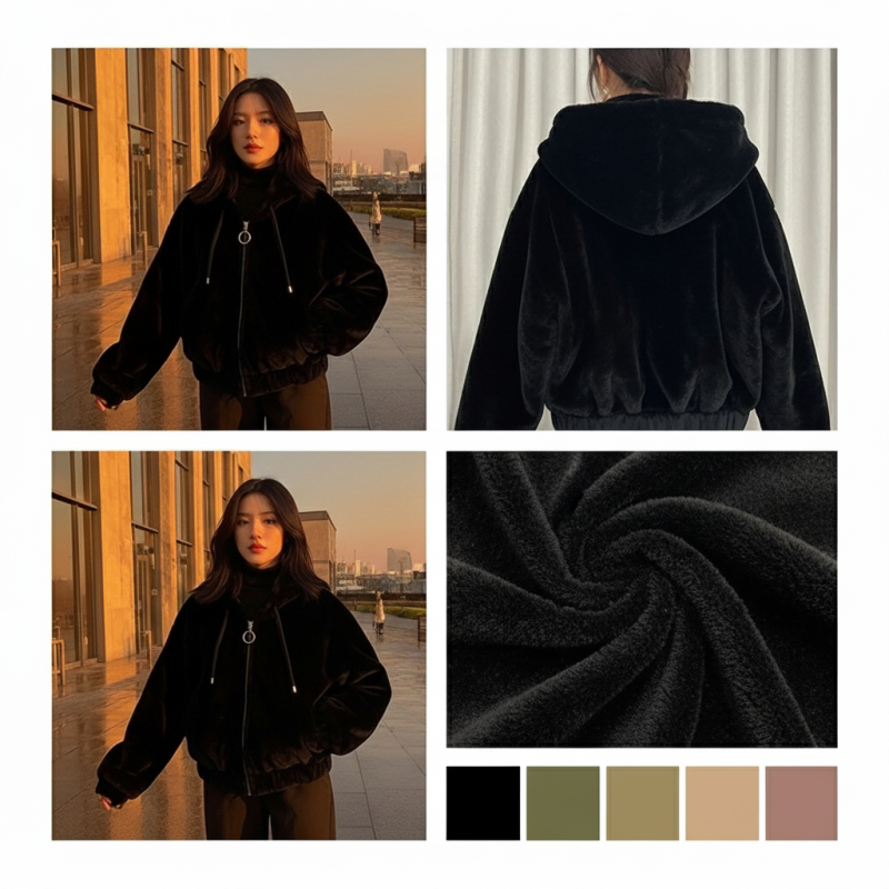 A cozy and chic bomber-style jacket made from ultra-soft fur. It features an attached hood, a full front zip closure, and an elasticated ribbed hem and cuffs. The cropped length and relaxed fit make it a stylish and warm piece for casual wear during cold weather