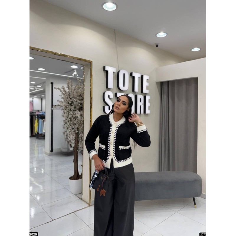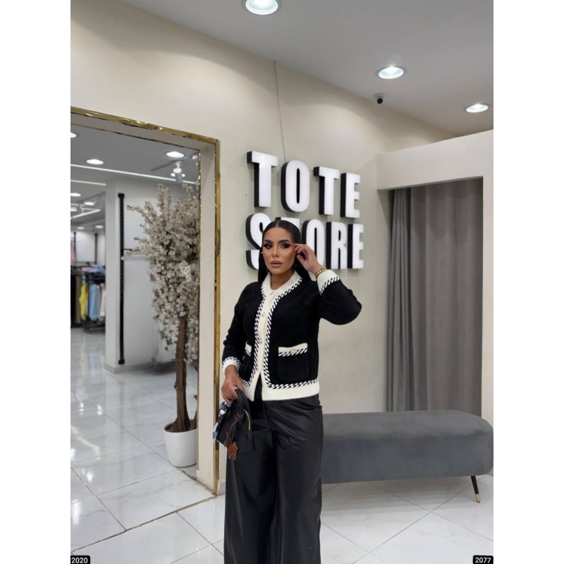 A stylish Fur pullover featuring contrasting trim along the edges, pockets, cuffs, and collar. It has a structured yet soft look, giving a chic and polished appearance. The design includes two front pockets and a front opening, making it suitable for layering over tops for everyday or elegant outings
