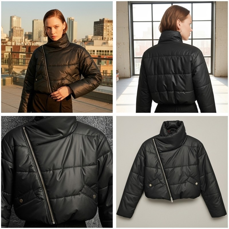 Tags: cropped puffer, leather puffer, asymmetric zip jacket, moto puffer, high neck jacket, winter streetwear, leather puffer, bomber