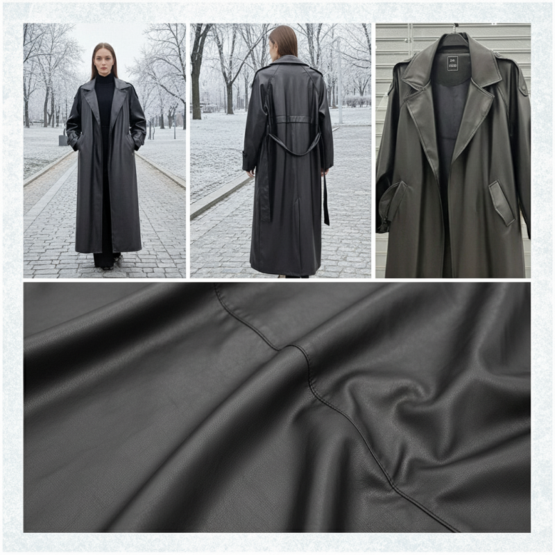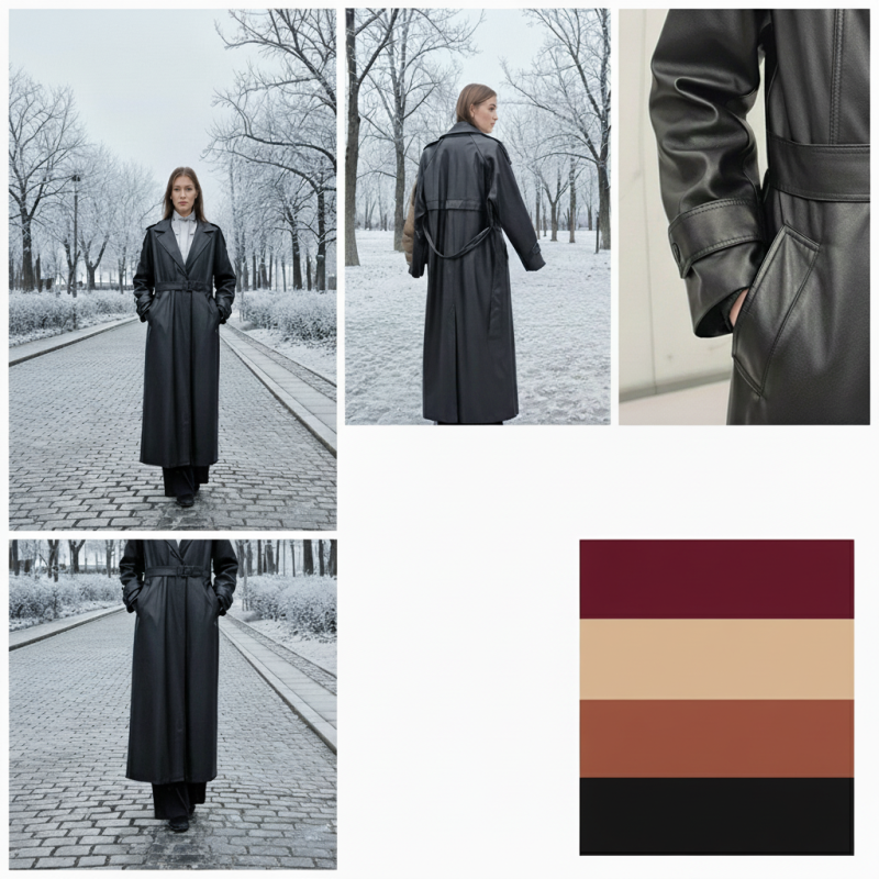 Tags: leather coat, leather trench, long coat, women’s trench, leather jacket, winter coat, belted trench, elegant coat