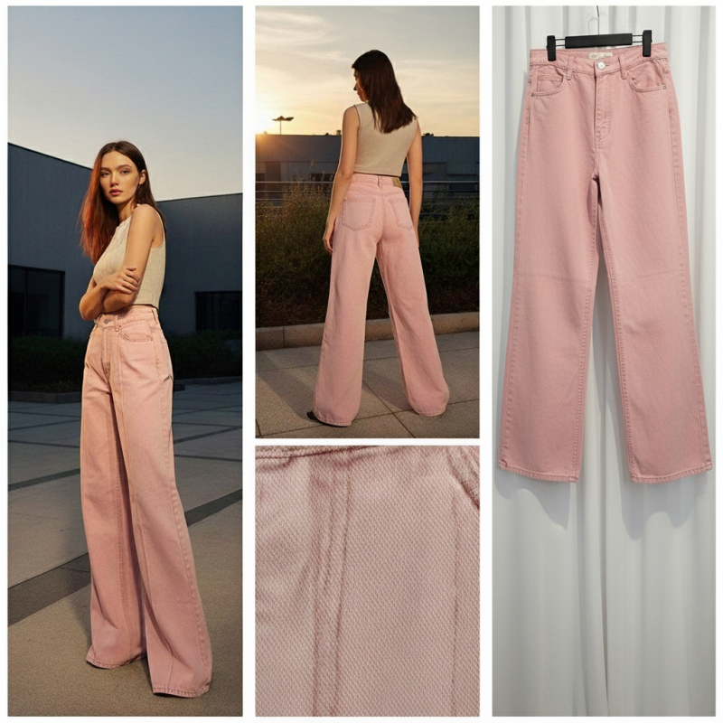 Tags: pink wide leg jeans, colored denim, dusty rose trousers, high waisted denim, relaxed fit pants, women's wide leg, washed denim, streetwear, casual pants