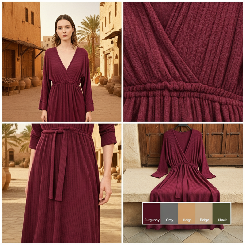 A long-sleeve dress designed with a flattering V-neck wrap-style top and a gathered elastic waist for a defined silhouette. Made of lightweight ribbed fabric that drapes beautifully, offering comfort and movement. Includes a matching waist tie that adds extra shape and elegance. Ideal for casual outings, evening looks, or seasonal styling