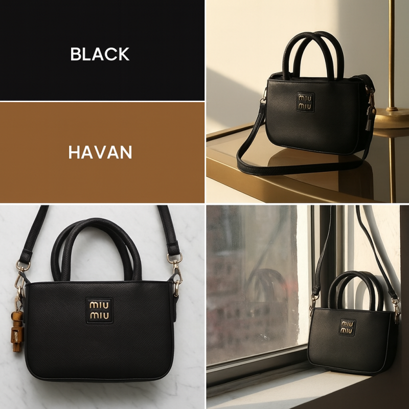 Tags: mini bag, structured handbag, rectangular bag, top handle bag, mini satchel, crossbody bag, pebbled texture, gold logo, small sophisticated bag, evening accessory