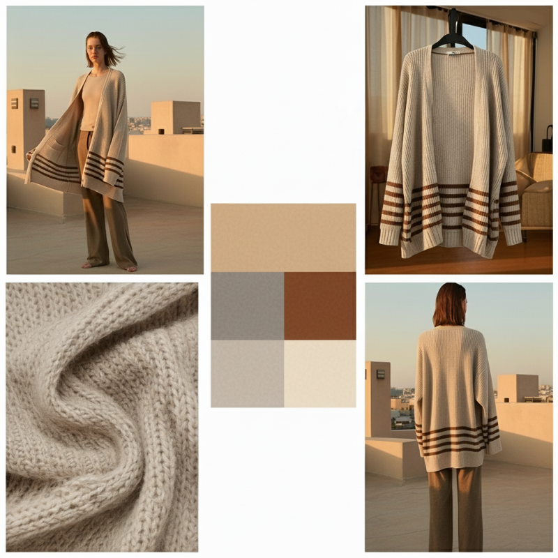كارديجان مريح وفضفاض مع نسيج محبوك مضلع بارز. يتميز بتصميم مفتوح من الأمام وأكمام طويلة. تم تفصيل الحافة بخطوط بنية عريضة ومتباينة، مما يضيف عنصراً رياضياً وكاجوال. هذا السترة المريحة مثالية للارتداء فوق البلوزات والفساتين في الطقس الانتقالي أو لإطلالة يومية مريحة.